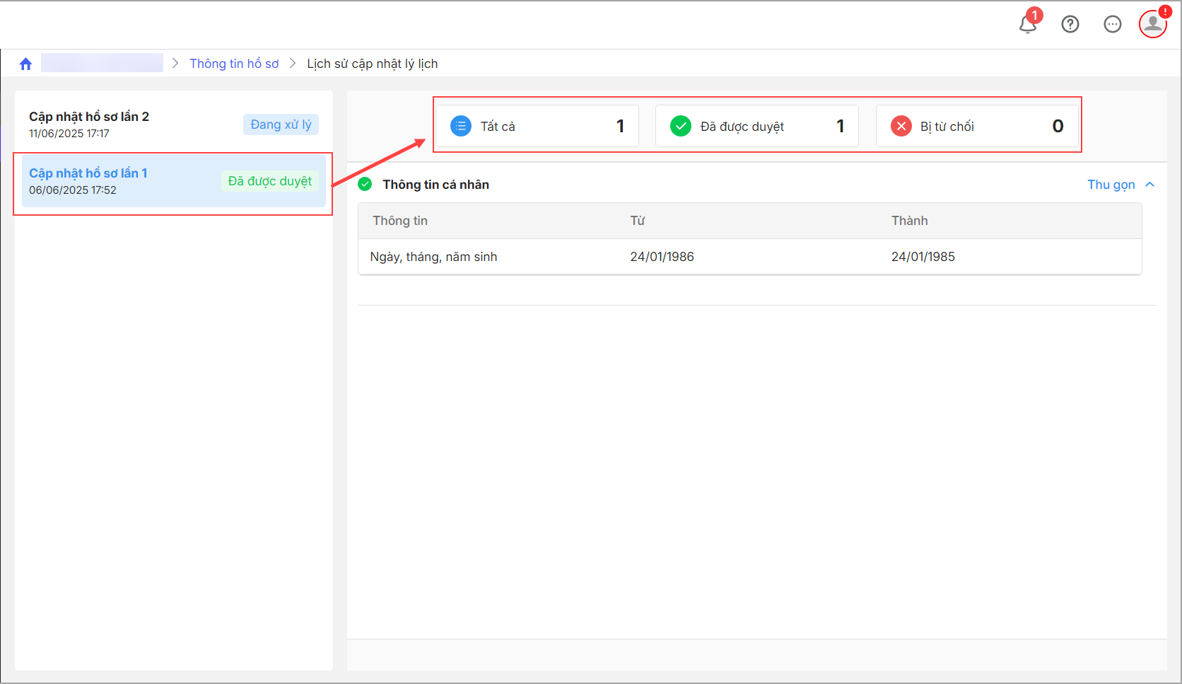 • Chọn vào từng lần cập nhật hồ sơ để xem kết quả phê duyệt hồ sơ