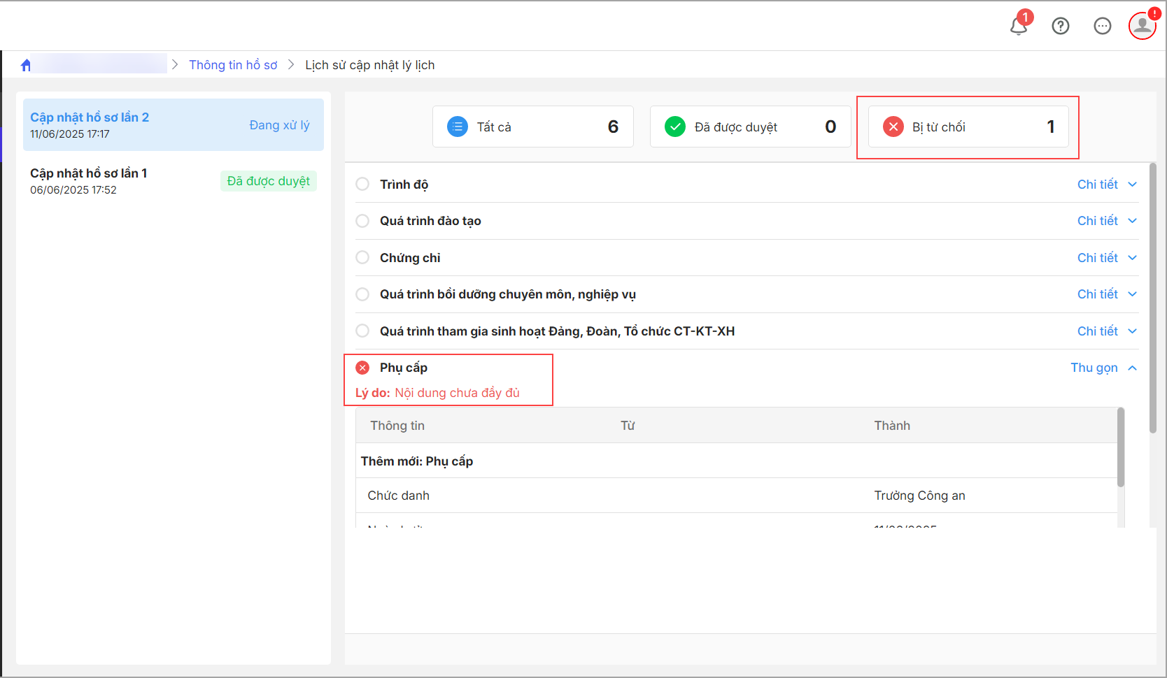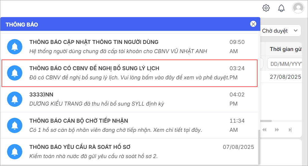 Mục đích: Giúp CBTC nhận thông báo khi có yêu cầu bổ sung lý lịch định kì từ cấp quản lý và theo dõi chi tiết lịch sử các lần gửi yêu cầu phê duyệt sau khi hoàn tất cập nhật hồ sơ.