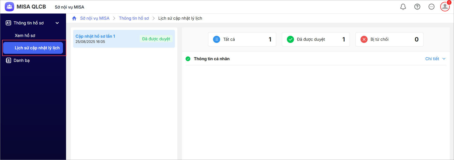 Sau khi CBTC kiểm tra hỗ trơ, CBNV đăng nhập vào tài khoản của mình, vào menu Thông tin hồ sơ\Lịch sử cập nhật lý lịch để theo dõi trạng thái duyệt hồ sơ