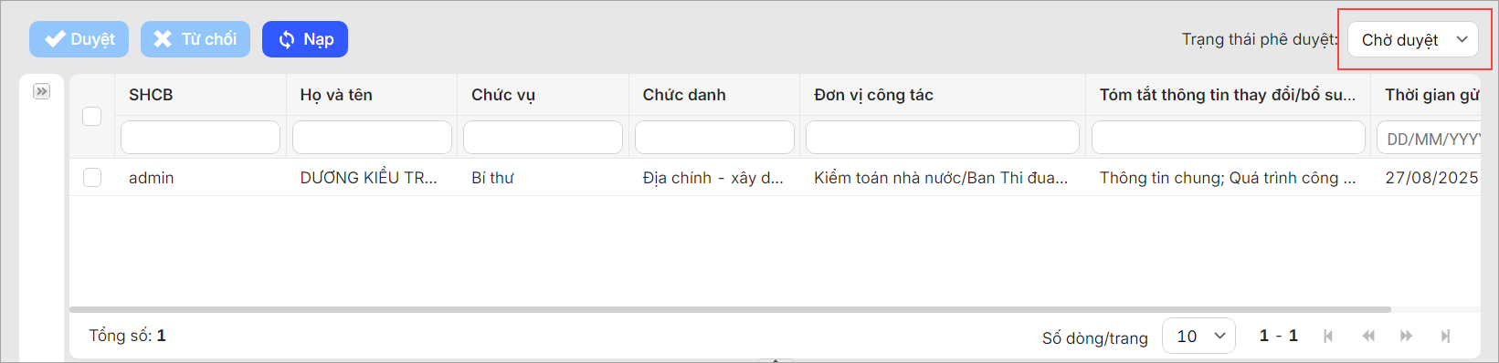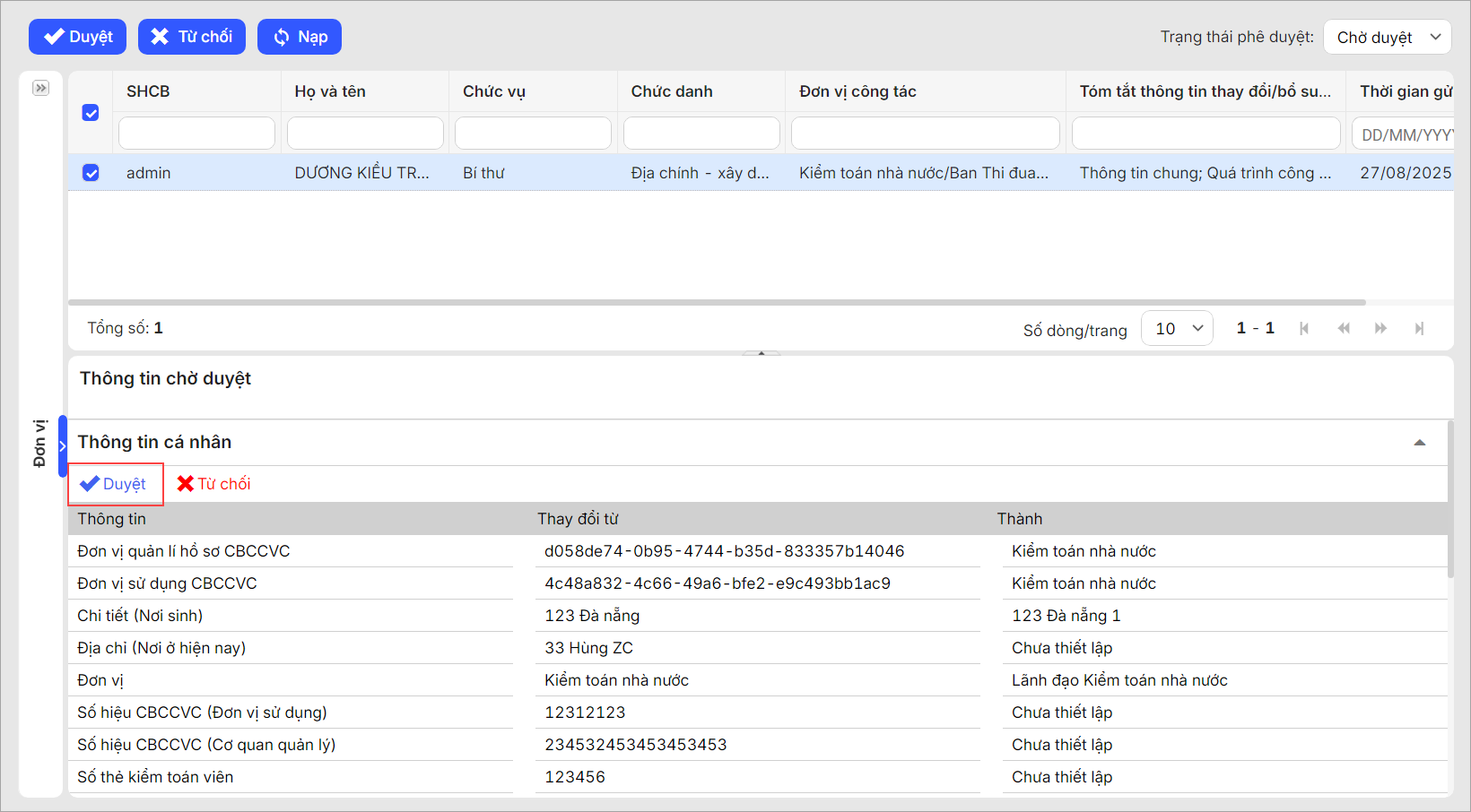 2. Hồ sơ CBNV đã cập nhật sẽ được hiển thị ở trạng thái Chờ phê duyệt. CBTC kiểm tra từng mục thông tin đã thay đổi để phê duyệt hoặc từ chối phê duyệt hồ sơ.