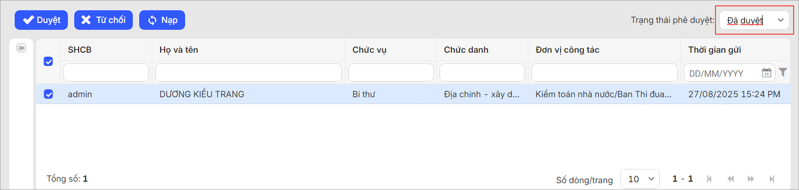 5. Để xem nhanh lịch sử những hồ sơ đã phê duyệt, anh/chị có thể lọc nhanh trạng thái Đã duyệt.