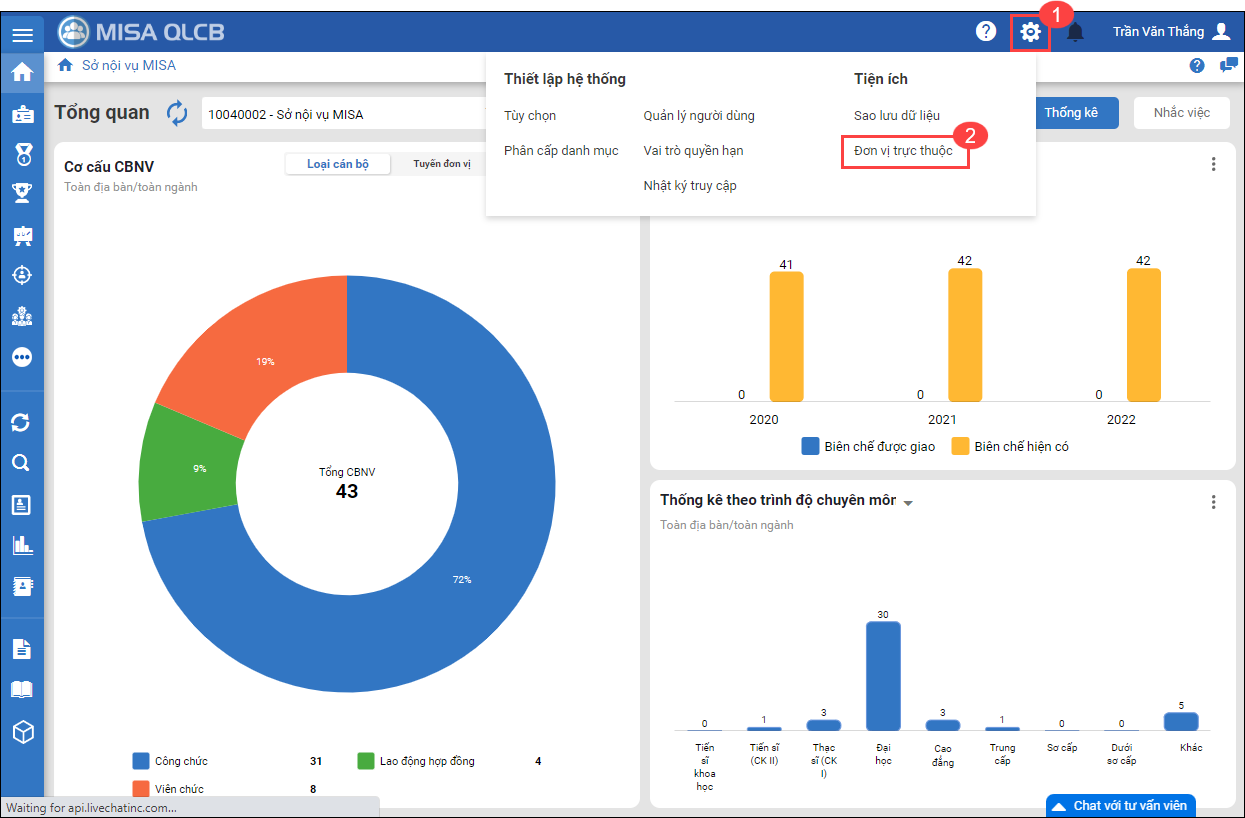 - Tại đơn vị chủ quản/đơn vị nội vụ, nhấn vào biểu tượng bánh răng, chọn Đơn vị trực thuộc vào menu Hệ thống\Đơn vị trực thuộc.