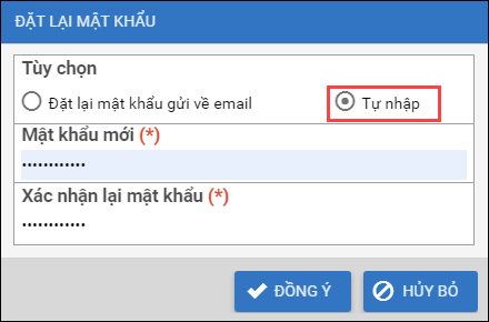 - Trường hợp chọn Tự nhập, chuyên viên đơn vị chủ quản có thể chủ động nhập lại mật khẩu mới cho CBNV cấp dưới.