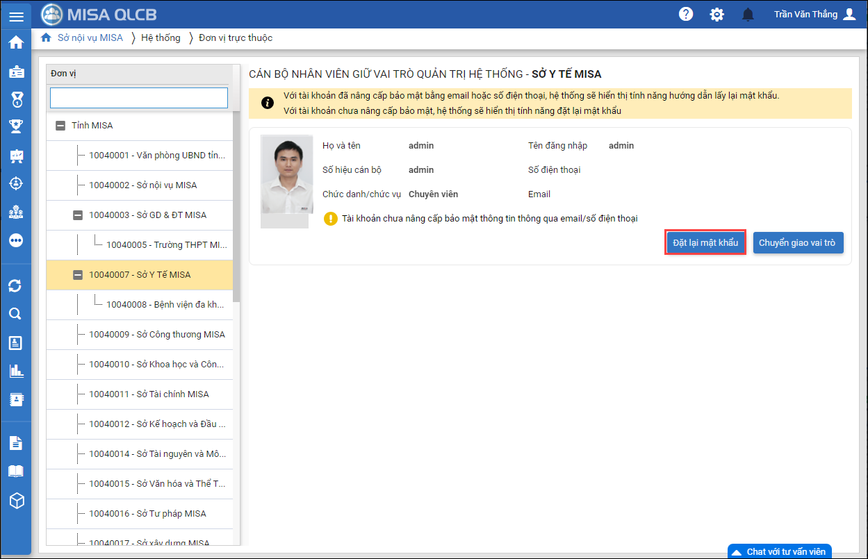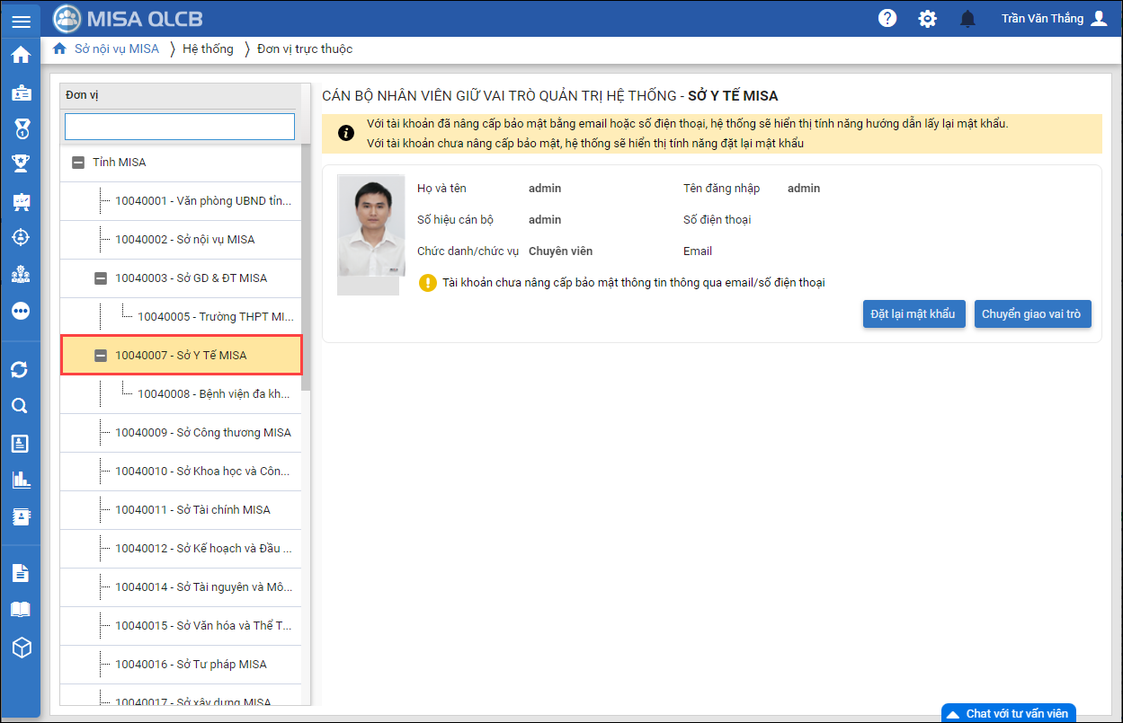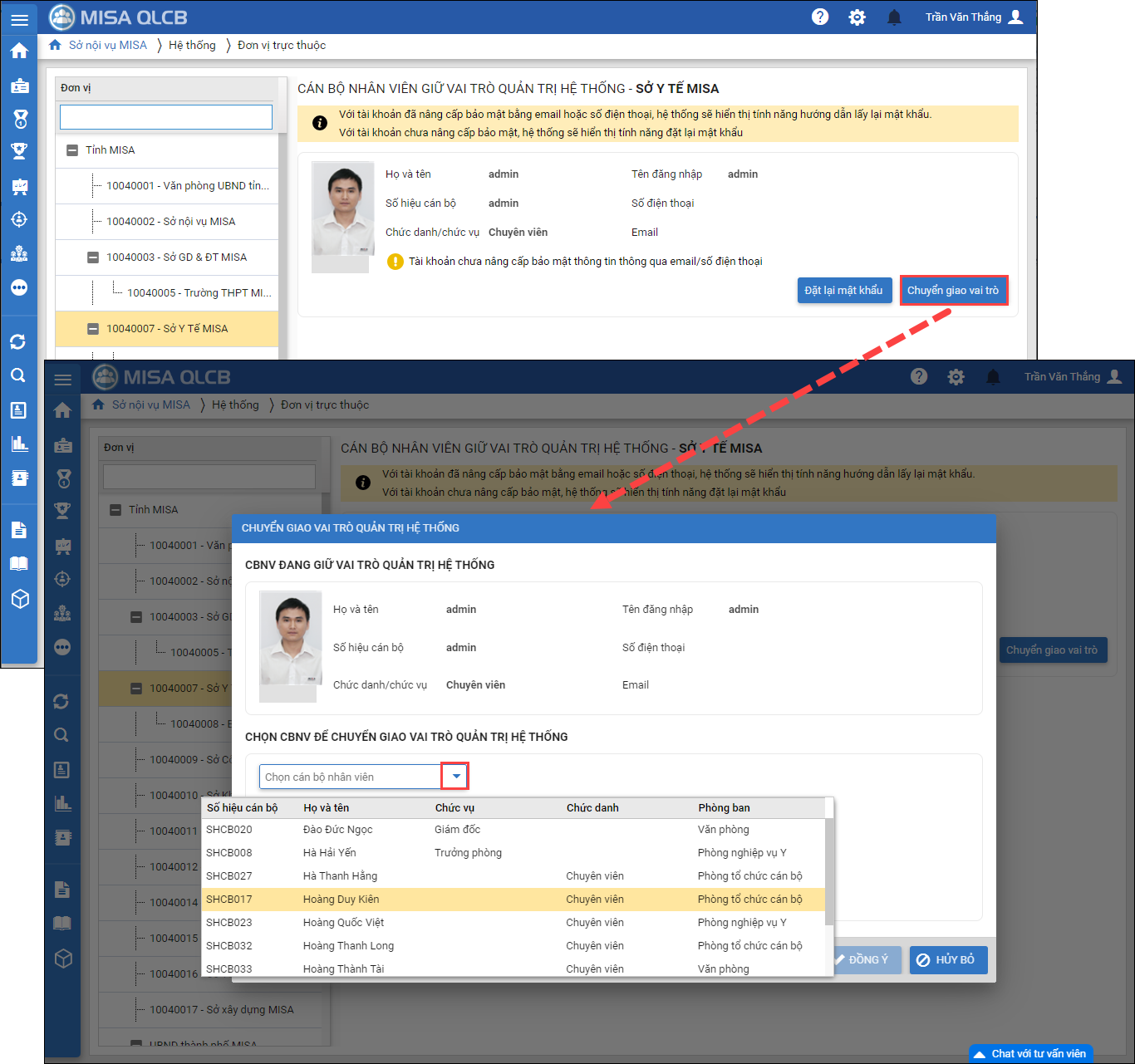 - Khi cần điều chuyển quyền admin cho người khác, có thể nhấn Chuyển giao vai trò. Chọn CBNV trong danh sáchđể chuyển giao vai trò và nhấn Đồng ý.