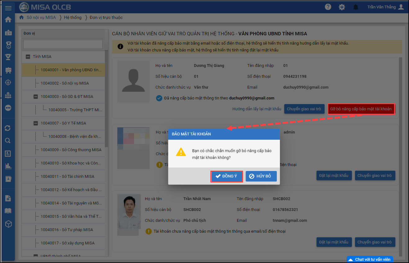 - Nếu chuyên viên chủ quản muốn đặt lại mật khẩu một cách nhanh chóng, anh/chị có thể chọn Gỡ bỏ nâng cấp bảo mật tài khoản.