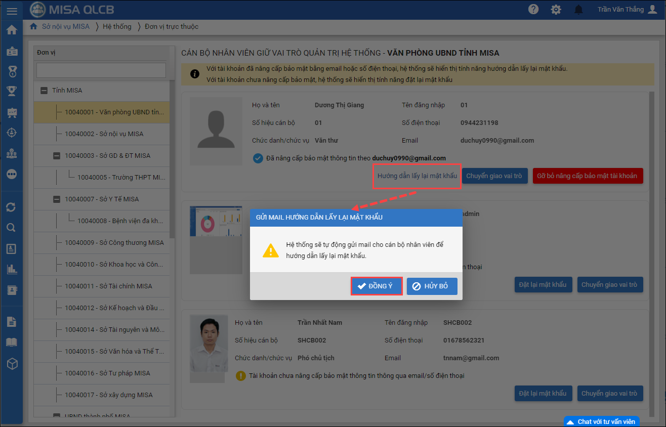 - Hoặc anh chị có thể nhấn Hướng dẫn lấy lại mật khẩu, khi đó hệ thống sẽ tự động gửi mail về cho CBNV đơn vị cấp dưới để CBNV có thể chủ động đổi mật khẩu.
