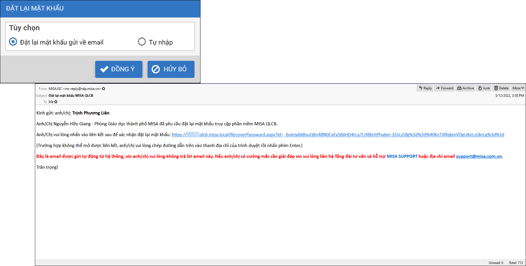 - Nếu chọn Đặt lại mật khẩu gửi về email, hệ thống sẽ tự động gửi lại mật khẩu mới về email của CBNV đơn vị cấp dưới như sau: