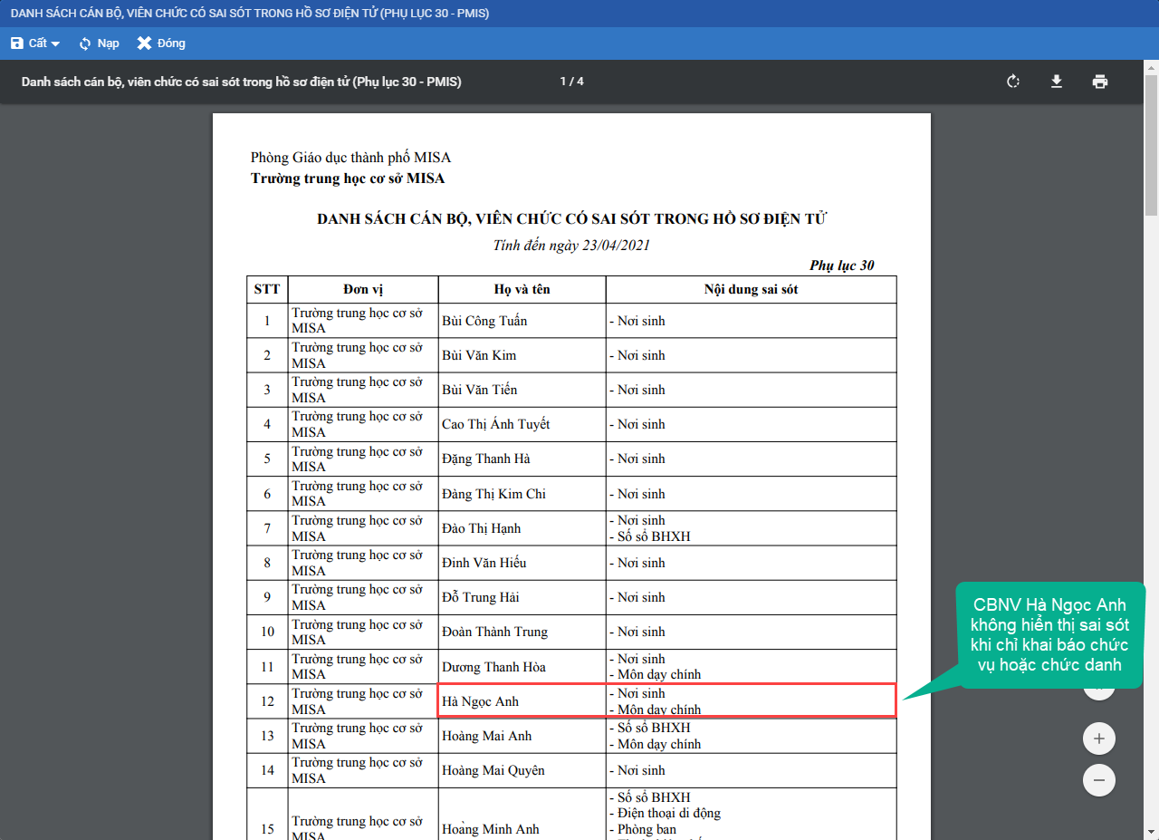 2. Trường hợp CBNV chỉ khai báo mình chức vụ hoặc chức danh, trên báo cáo Danh sách Cán bộ, viên chức có sai sót trong hồ sơ điện tử sẽ không hiển thị sai sót.