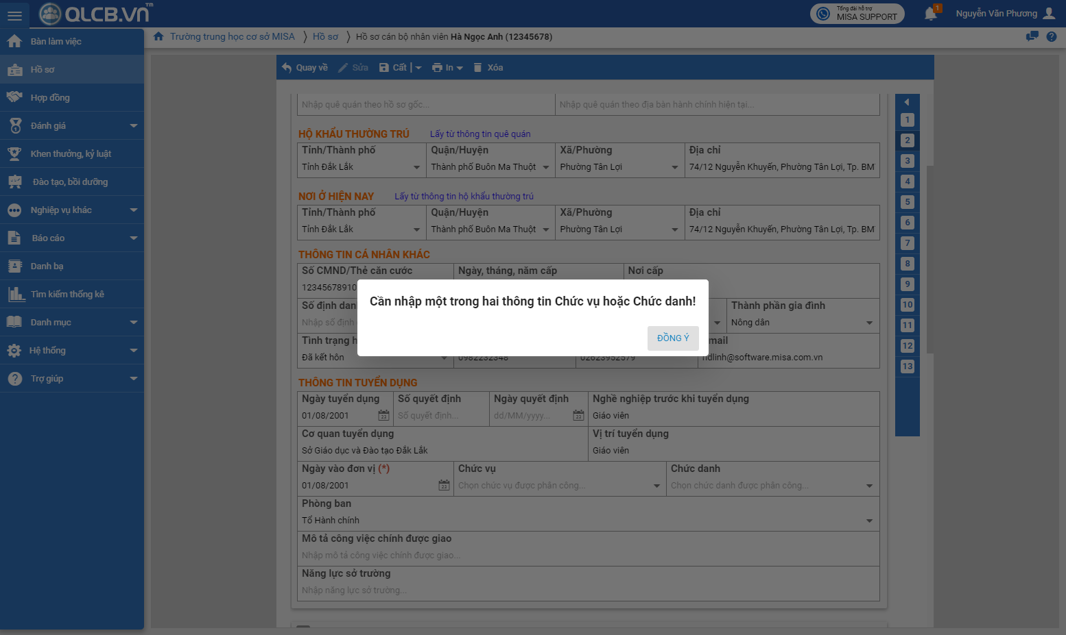 1. Tại menu Hồ sơ, khi khai báo Thông tin chung của CBNV, tại phần khai báo Chức vụ, Chức danh, nếu anh/chị để trống thì khi Cất hồ sơ, phần mềm sẽ hiển thị cảnh báo Cần nhập một trong hai thông tin chức vụ hoặc chức danh.