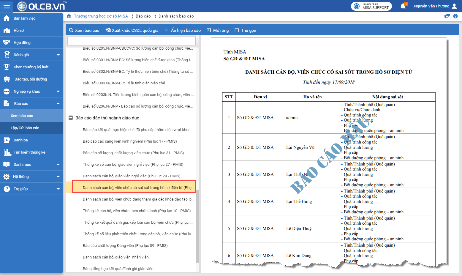 - Vào menu Báo cáo\Xem báo cáo, chọn xem Danh sách cán bộ, viên chức có sai sót trong hồ sơ điện tử.