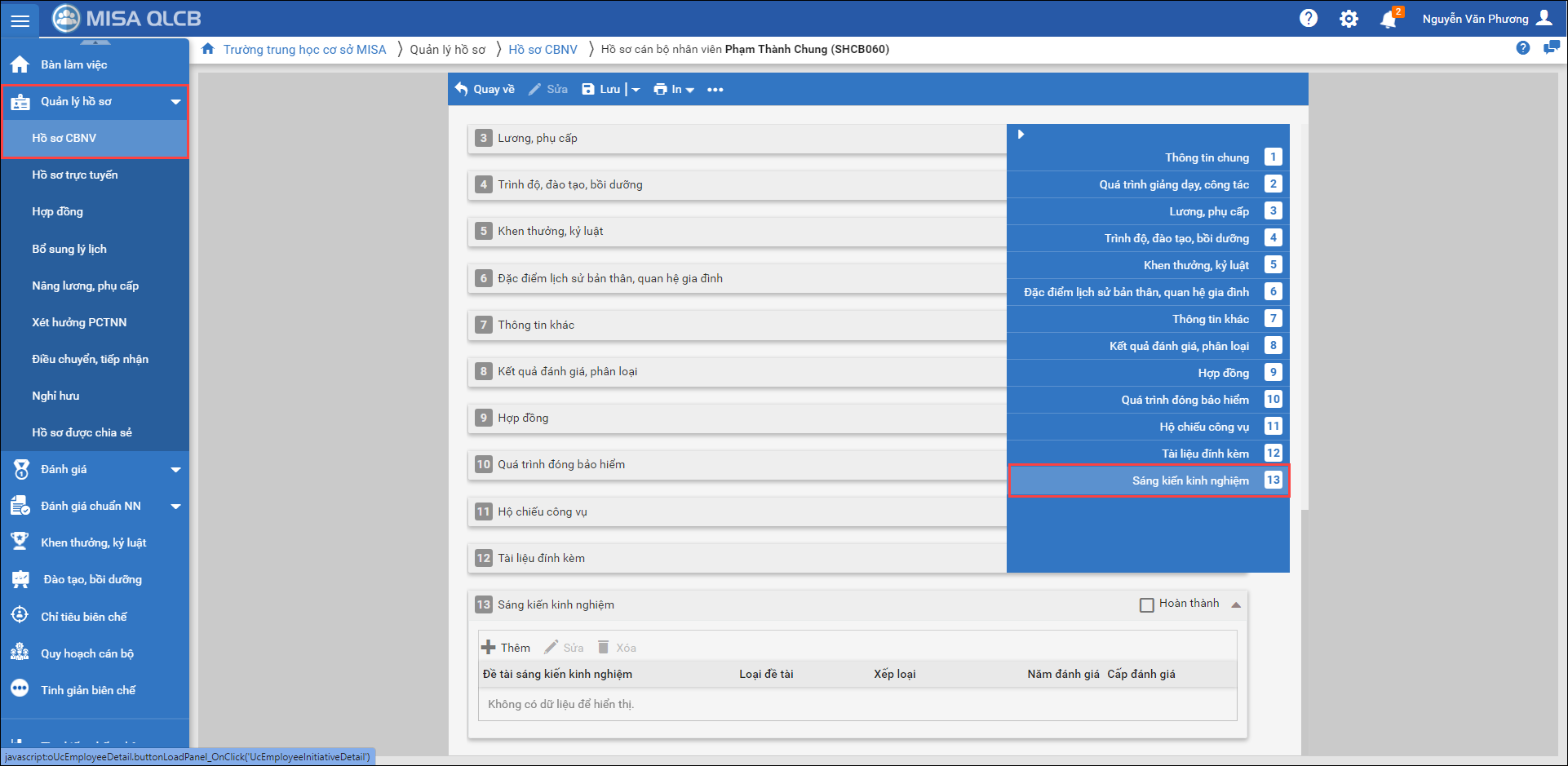1. Tại menu Quản lý hồ sơ\Hồ sơ CBNV, vào phần 13. Sáng kiến kinh nghiệm.