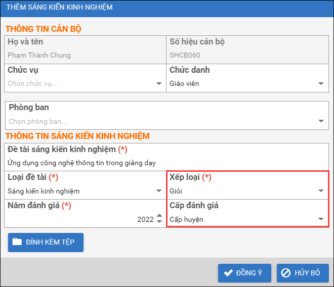 2. Tại đây khi khai báo sáng kiến kinh nghiệm, phần mềm đã bổ sung các xếp loại: Đạt/Giỏi/Không đạt, đồng thời bổ sung cấp đánh giá bao gồm Cấp Tỉnh, Cấp Huyện.
