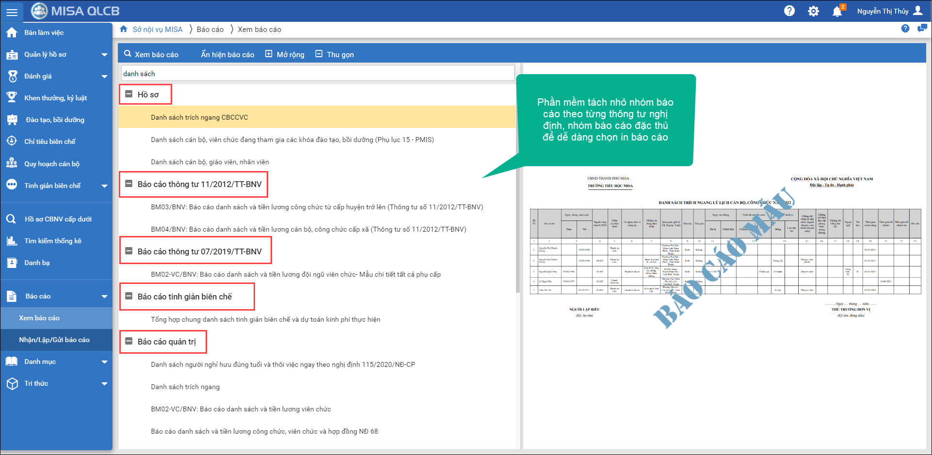 Phần mềm tách nhỏ các nhóm báo cáo theo từng thông tư nghị định, nhóm báo cáo đặc thù đảm bảo dễ dàng chọn được in báo cáo theo mong muốn. Đồng thời phần mềm mặc định ẩn/hiện báo cáo linh hoạt theo loại hình/tuyến đơn vị.