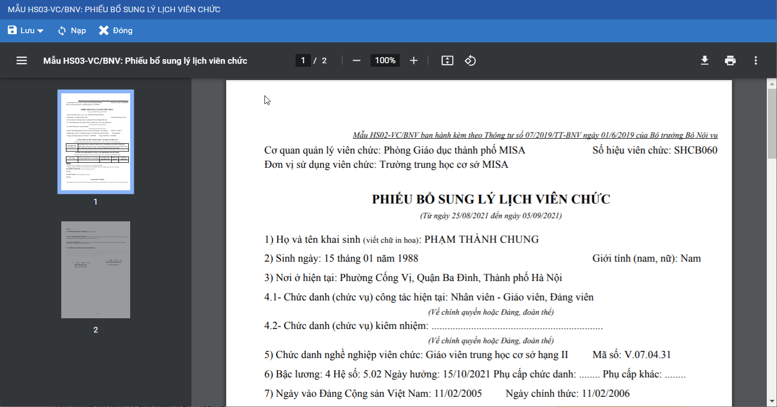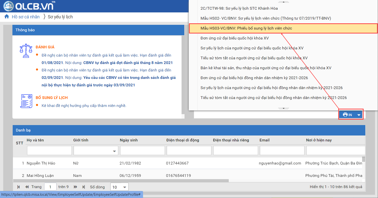 3. Ngoài ra, tại màn hình bổ sung lý lịch định kỳ của CBNV, nhấn In. Tại đây CBNV cũng có thể in mẫu như trên.