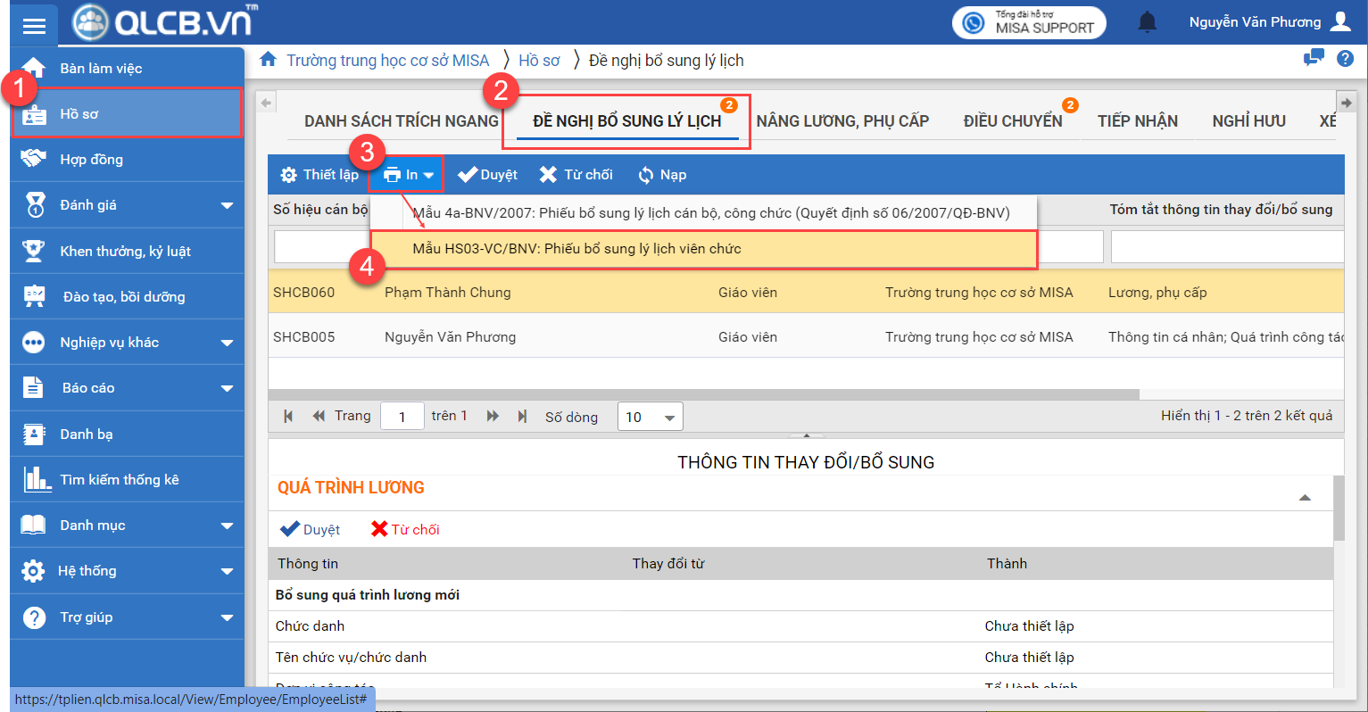 1. Vào menu Hồ sơ\tab Đề nghị bổ sung lý lịch, nhấn In. Tại đây phần mềm đã bổ sung Mẫu HS03-VC\BNV: Phiếu bổ sung lý lịch viên chức.