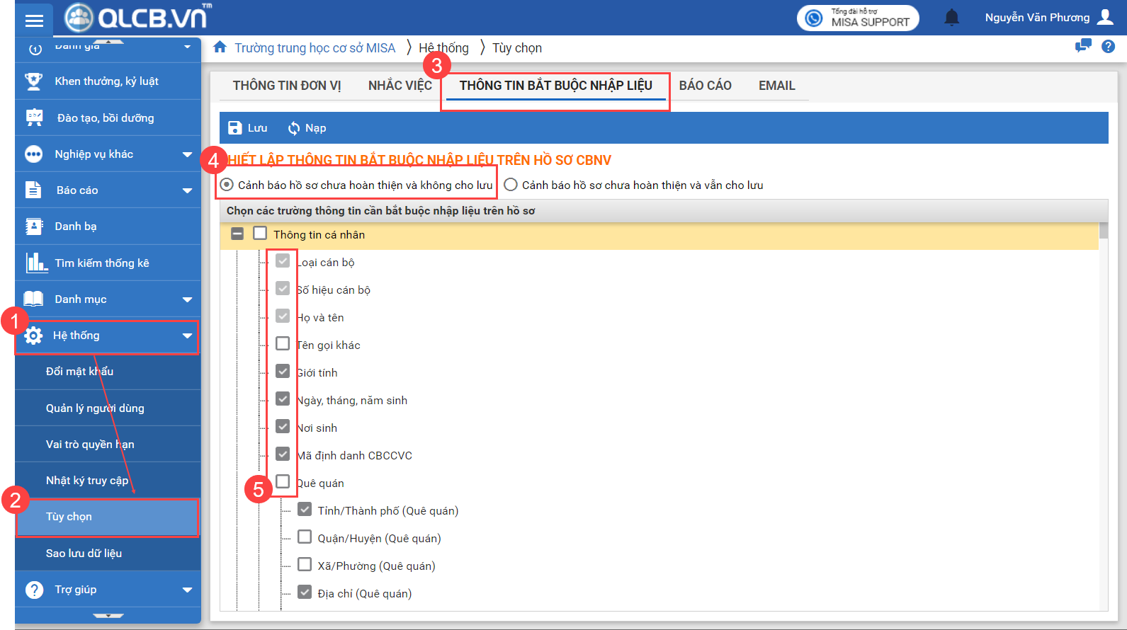 1. Khi tích chọn Cảnh báo hồ sơ chưa hoàn thiện và không cho lưu: