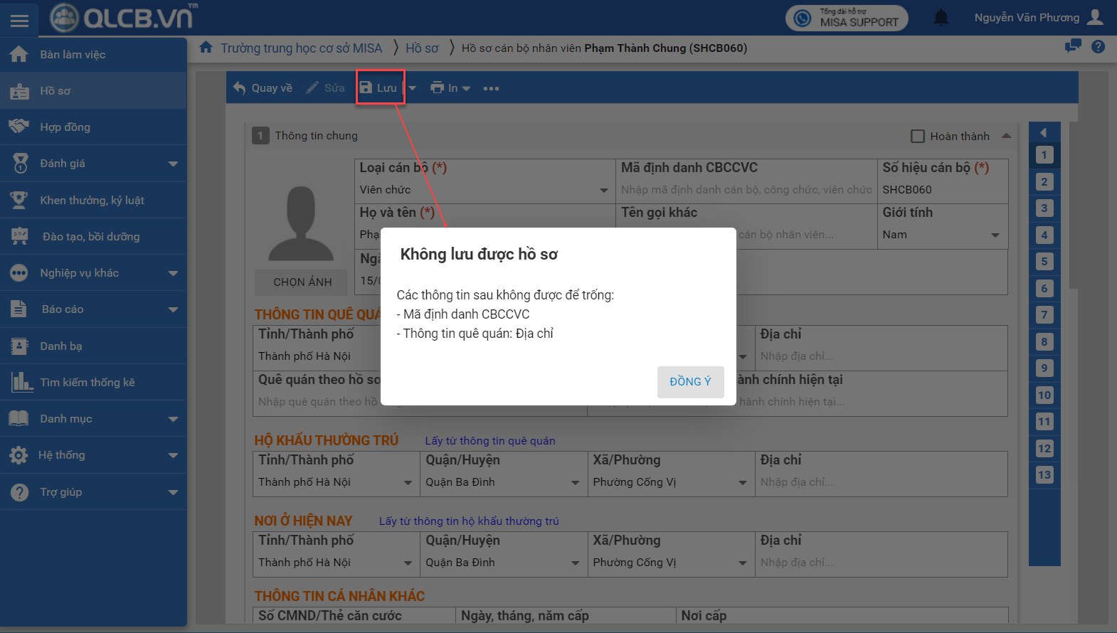 • Khi CBNV khai báo thông tin hồ sơ của bản thân, nếu khai báo thiếu các trường thông tin mà CBTC tích chọn bắt buộc nhập liệu ở trên, phần mềm sẽ hiện cảnh báo Không lưu được hồ sơ và không cho phép lưu.