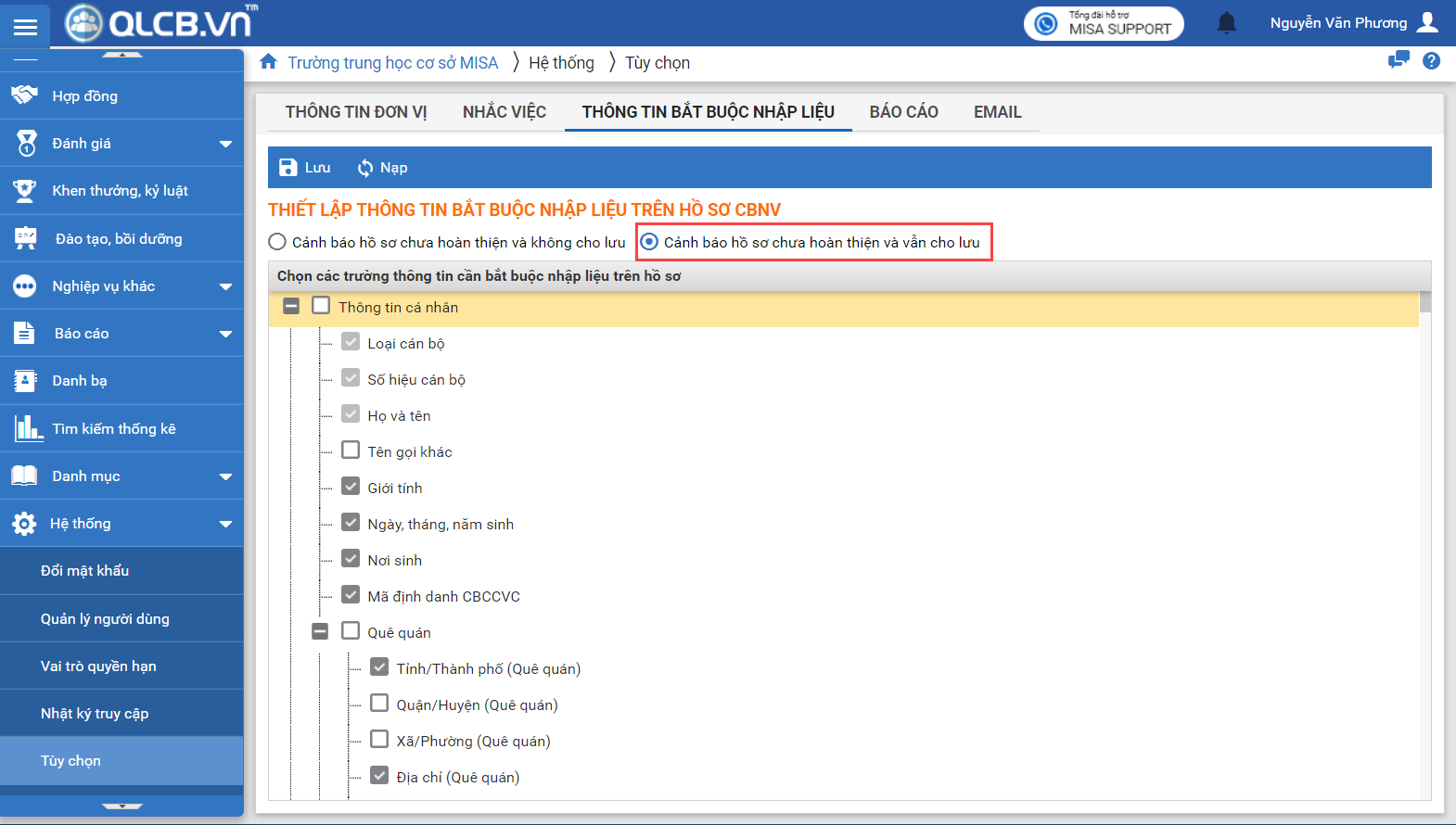 • Khi CBNV khai báo thông tin hồ sơ của bản thân, nếu khai báo thiếu các trường thông tin mà CBTC tích chọn bắt buộc nhập liệu ở trên, phần mềm sẽ hiện cảnh báo thiếu các thông tin và vẫn cho lưu hồ sơ.