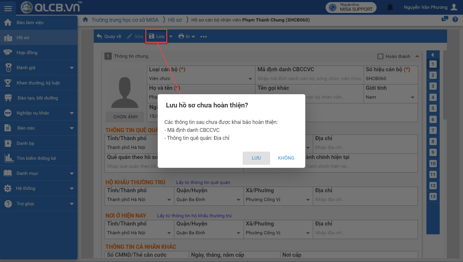 • Nhấn Lưu để lưu hồ sơ hoặc nhấn Không để thực hiện cập nhật đủ thông tin hồ sơ trên phần thông báo.