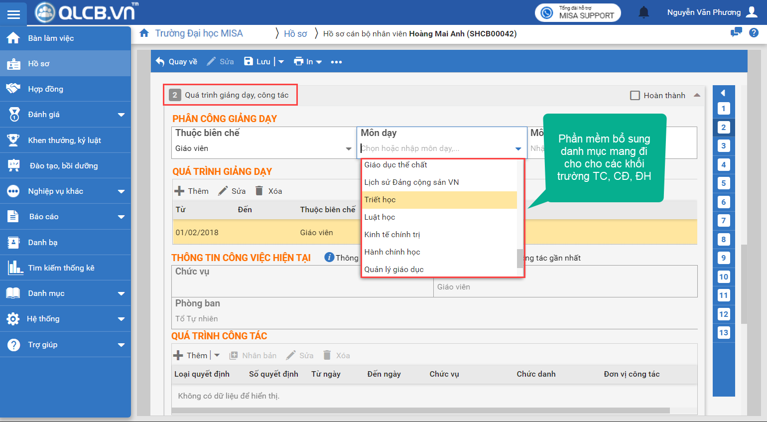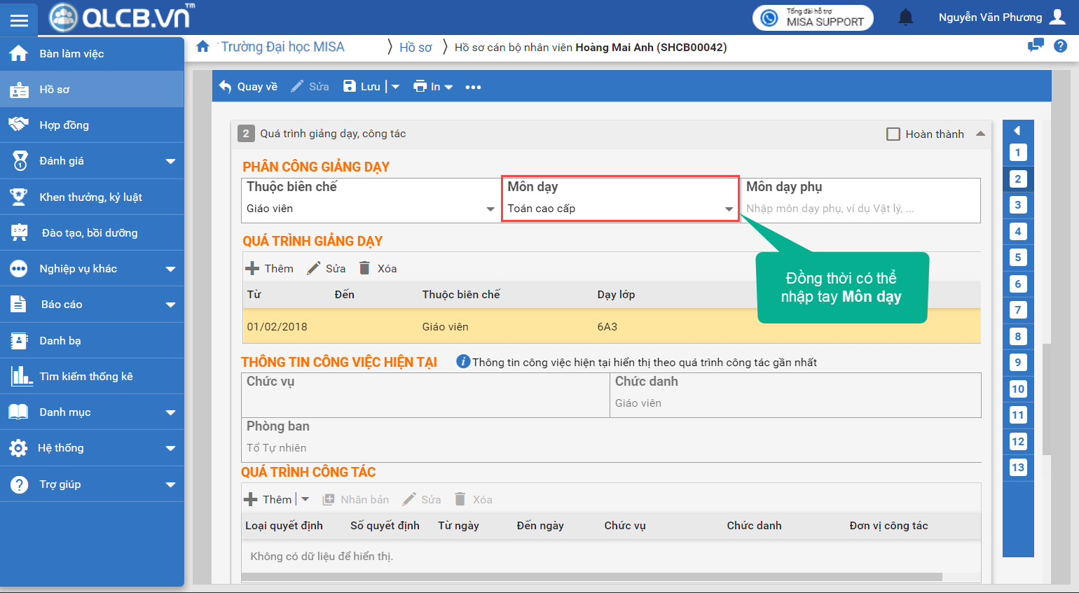 2. Đồng thời phần mềm cho phép nhập tay Môn dạy tại Quá trình giảng dạy, công tác.