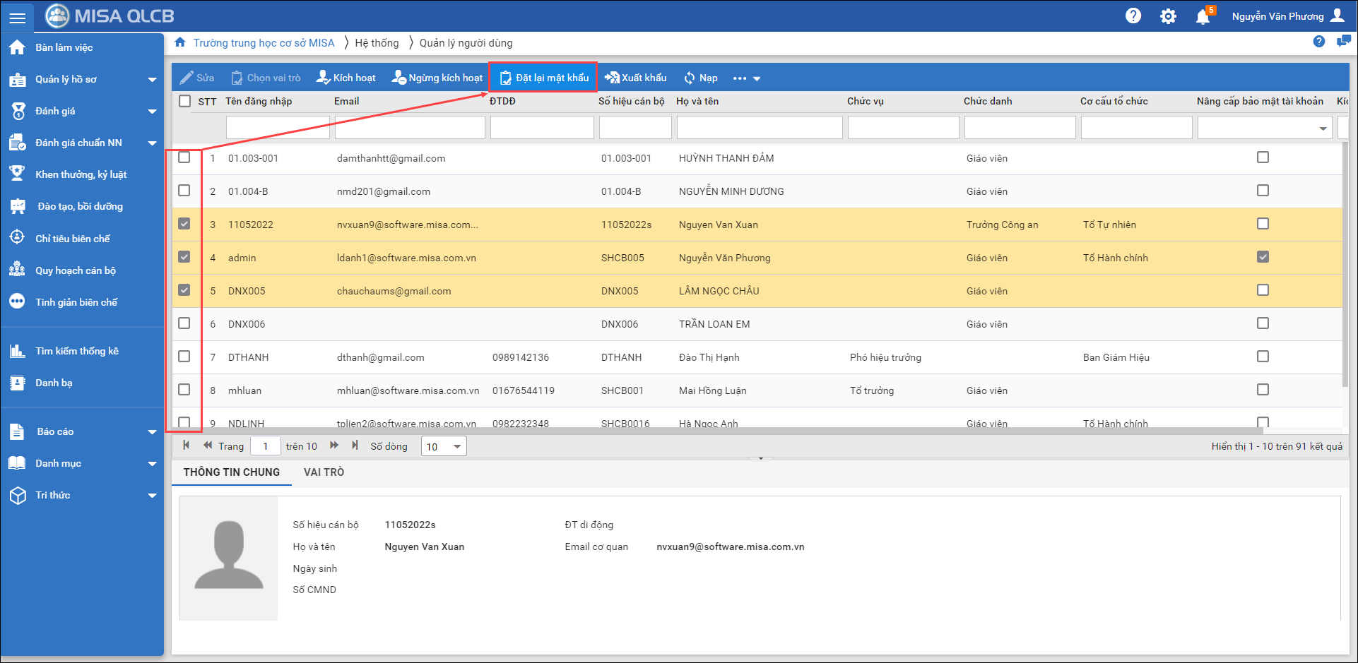 6. Nhấn Đồng ý và thực hiện đặt lại mật khẩu cho CBNV đó để CBNV có thể vào lại hệ thống và nâng cấp lại theo đúng địa chỉ email/sđt của mình.