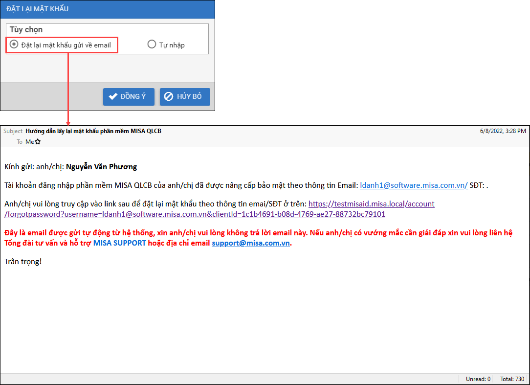 3. Nếu chọn Đặt lại mật khẩu gửi về email, hệ thống sẽ tự động gửi thông báo yêu cầu đặt lại mật khẩu MISA QLCB về email của CBNV tương ứng.