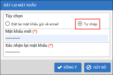 4. Hoặc nếu chọn Tự nhập, CBTC có thể nhập mật khẩu mới cho CBNV và chủ động thông báo lại.