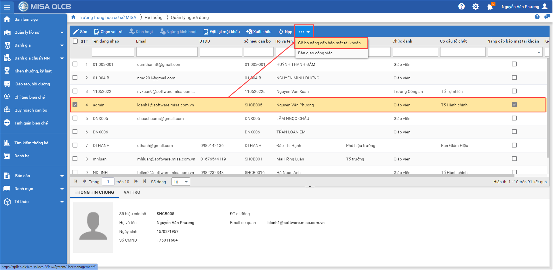 5. Với trường hợp CBNV đã nâng cấp bảo mật tài khoản nhưng bị sai lệch mail/sđt thì anh chị có thể dễ dàng Gỡ bỏ nâng cấp bảo mật của CBNV.