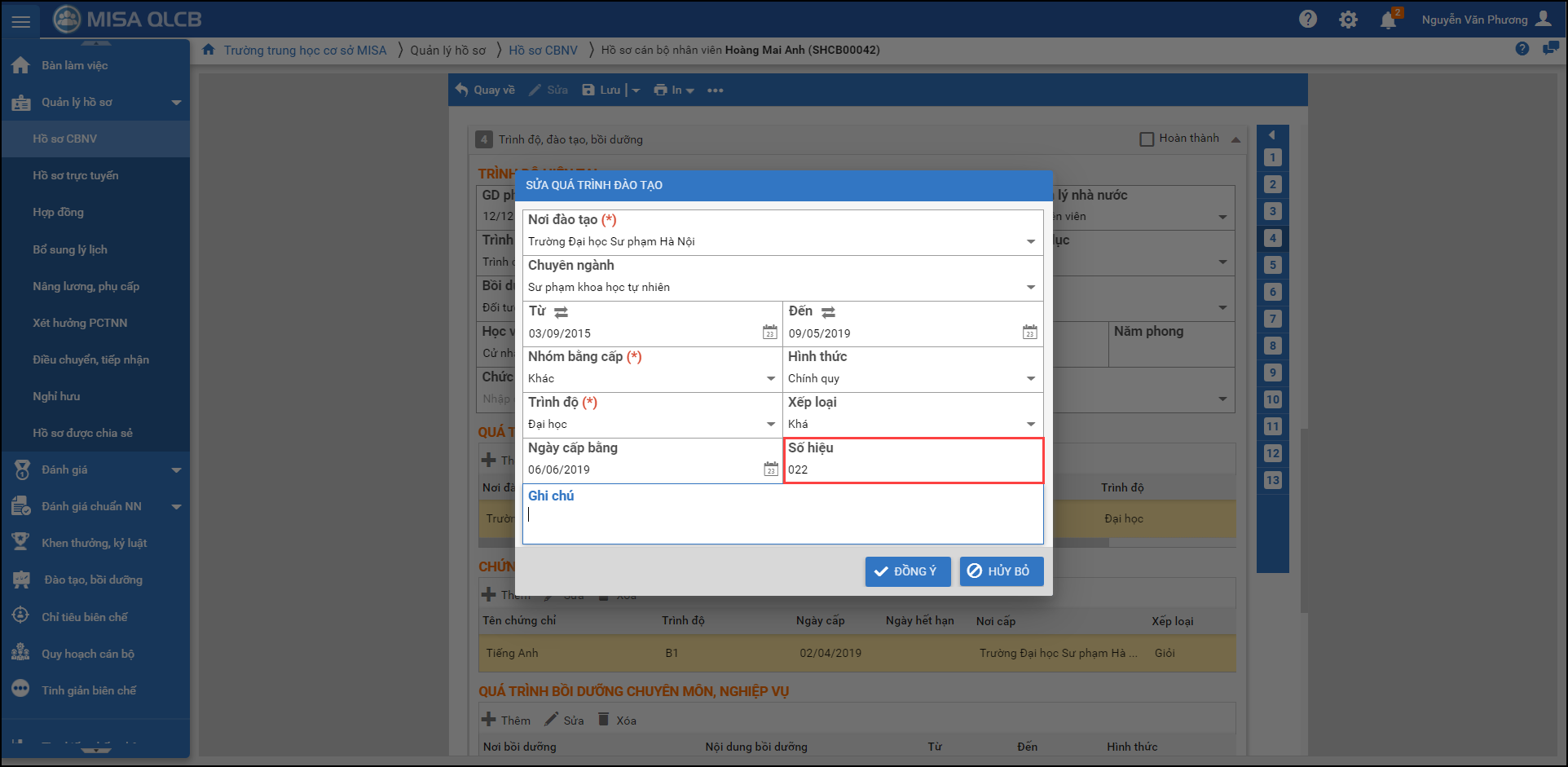 2. Tương tự, khi khai báo bằng cấp cũng có thể khai báo Số hiệu.