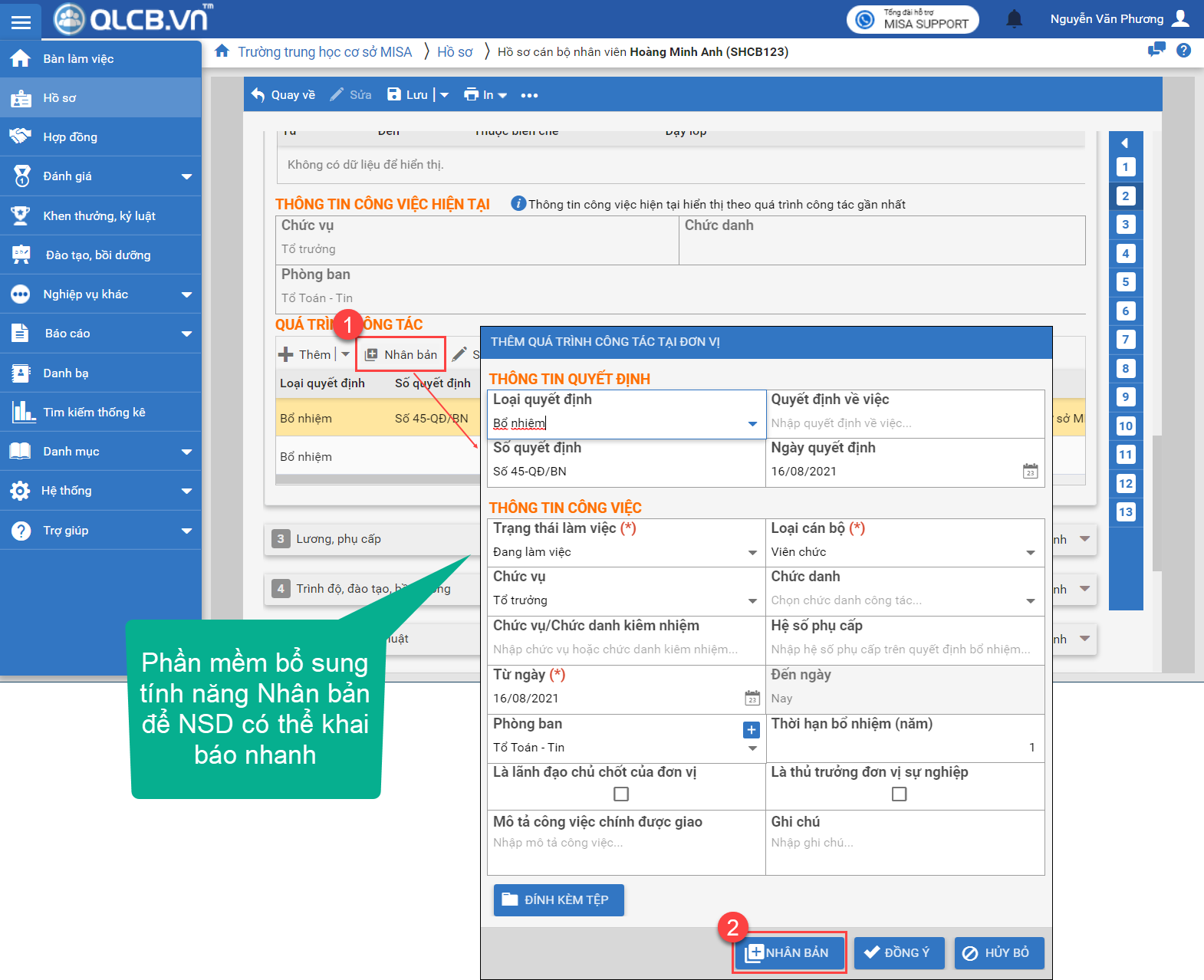 1. Tại phần Quá trình công tác, có thể nhấn Nhân bản tại thanh công cụ hoặc nhấn Nhân bản tại giao diện thêm quá trình công tác tại đơn vị: