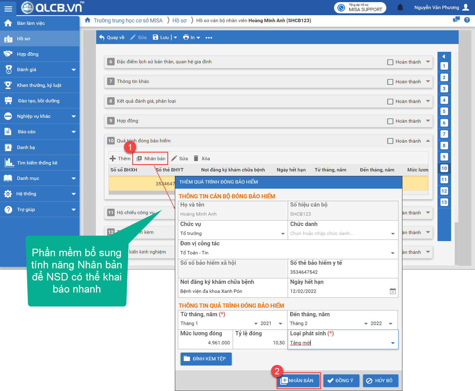 Tại giao diện khai báo hồ sơ của CBNV, phần mềm đã bổ sung tính năng nhân bản ở màn hình của cả CBTC và CBNV tự cập nhật tại các phần: