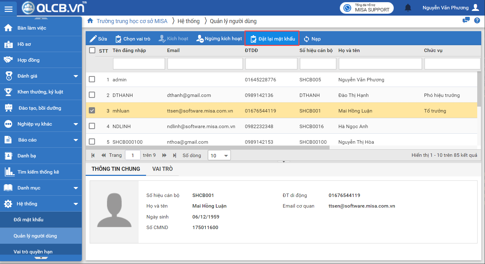 1. Tại giao diện Quản lý người dùng, nhấn Đặt lại mật khẩu.