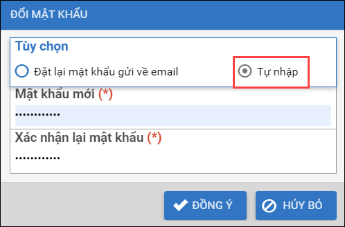 - Khi tích chọn Tự nhập, anh/chị nhập lại mật khẩu mới và nhập xác nhận lại mật khẩu. Nhấn Đồng ý để đặt lại mật khẩu.