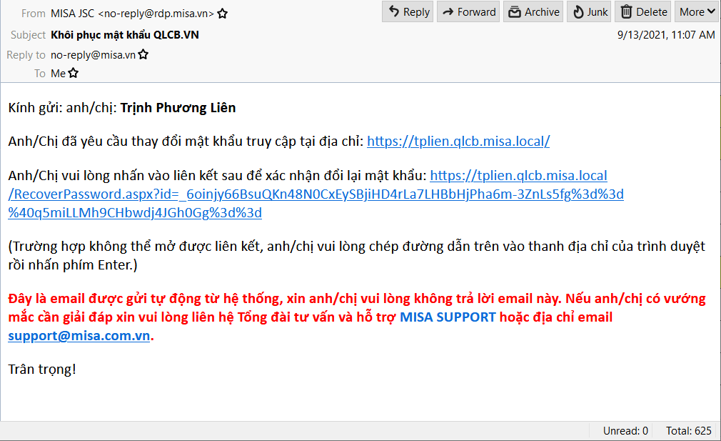 - Với KH đã nâng cấp MISA ID thì có cảnh báo không cho đặt lại mật khẩu