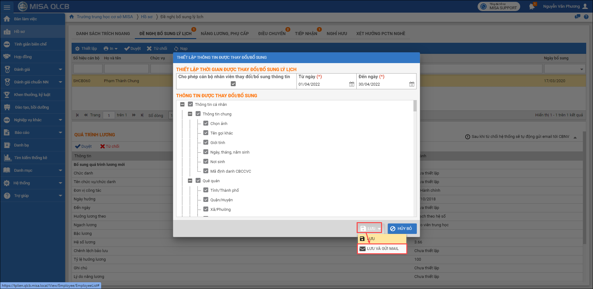 1. Tại menu Hồ sơ\Đề nghị bổ sung lý lịch định kỳ, sau khi thiết lập đợt bổ sung lý lịch, nhấn Lưu. Tại đây phần mềm bổ sung chức năng Lưu và gửi, cho phép CBTC gửi email thông báo tới CBNV.