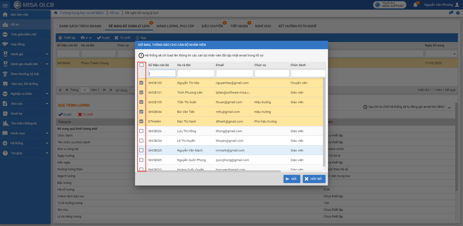 Anh/chị tích chọn những CBNV cần gửi mail thông báo bổ sung lý lịch định kỳ, nhấn Gửi.