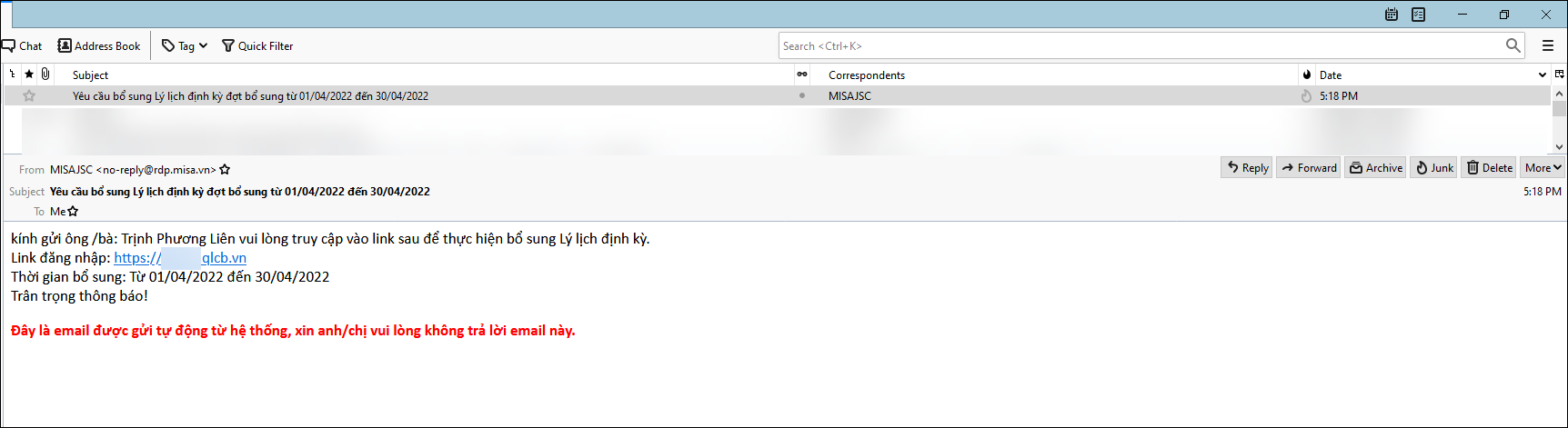 3. Khi đó những CBNV được tích chọn gửi mail sẽ nhận được mail về việc bổ sung lý lịch định kỳ.