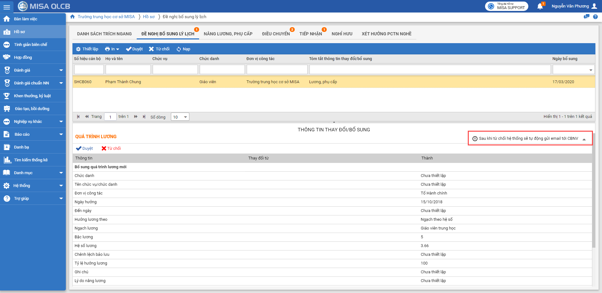 – Trước phiên bản R53, khi thực hiện bổ sung lý lịch theo yêu cầu, sau khi CBNV thực hiện cập nhật lý lịch của bản thân sẽ gửi về cho CBTC. CBTC thực hiện phê duyệt hoặc từ chối những thông tin mà CBNV đã cập nhật. Nếu các thông tin đúng hoàn toàn, CBTC sẽ thực hiện duyệt và cập nhật vào hồ sơ của CBNV. Nếu có thông tin chưa chính xác hoặc thiếu, CBTC sẽ từ chối và thông báo lại cho CBNV cần cập nhật lại những thông tin nào.