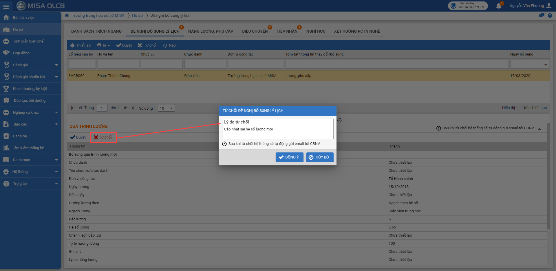 4. Nhập lý do từ chối, nhấn Đồng ý. Sau khi từ chối hệ thống sẽ tự động gửi mail về CBNV.