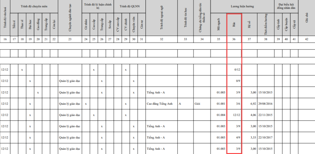 Khi in báo cáo BM02 TT07 hoặc Danh sách trích ngang, thông tin bậc lương được hiển thị như dưới đây: