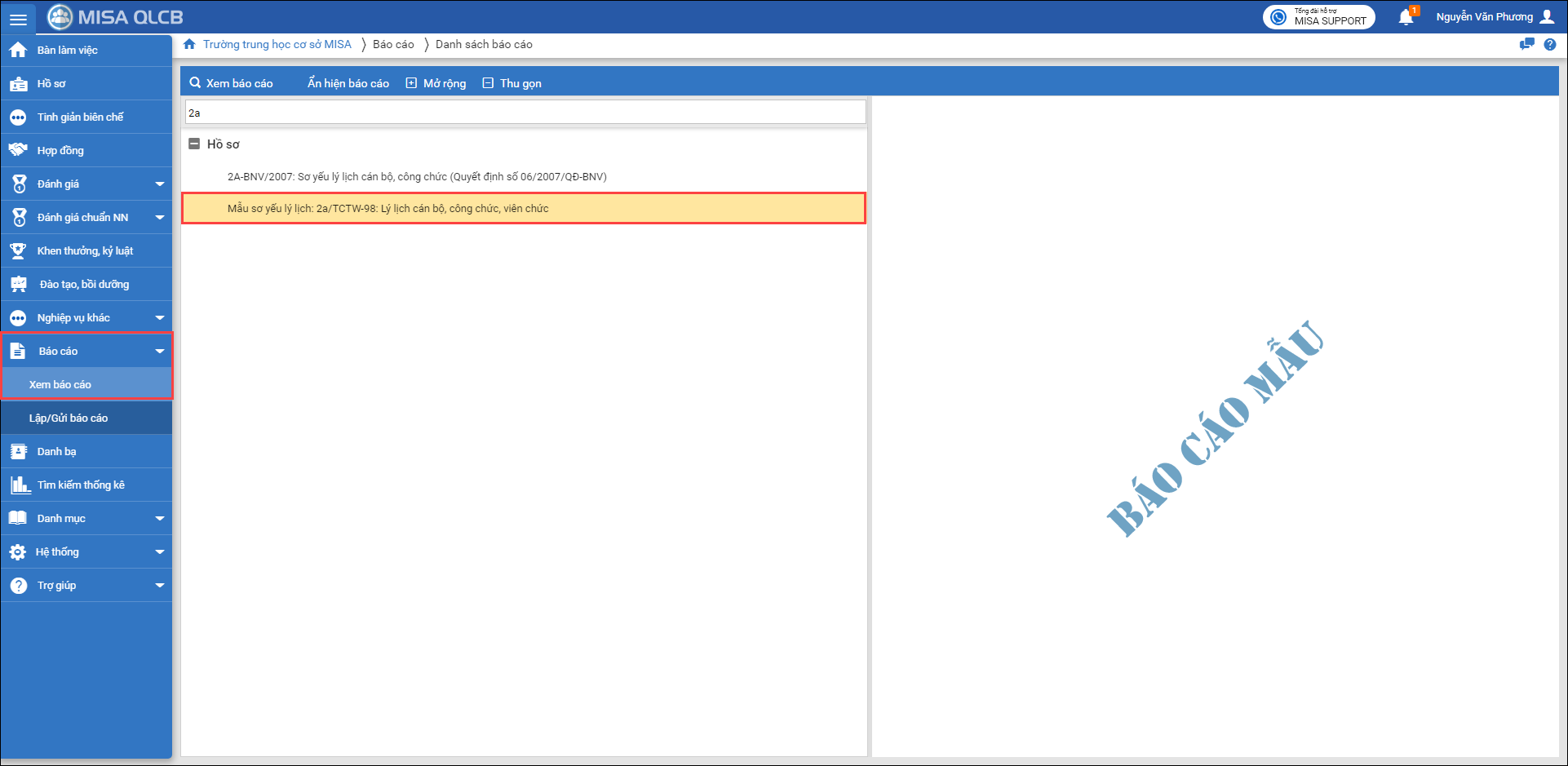 1. Tại menu Báo cáo\Xem báo cáo, phần mềm đã bổ sung Mẫu sơ yếu lý lịch 2a/TCTW-98: Lý lịch cán bộ, công chức, viên chức.