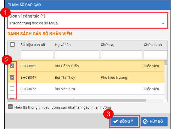 - (1): Chọn đơn vị có CBNV cần in sơ yếu lý lịch