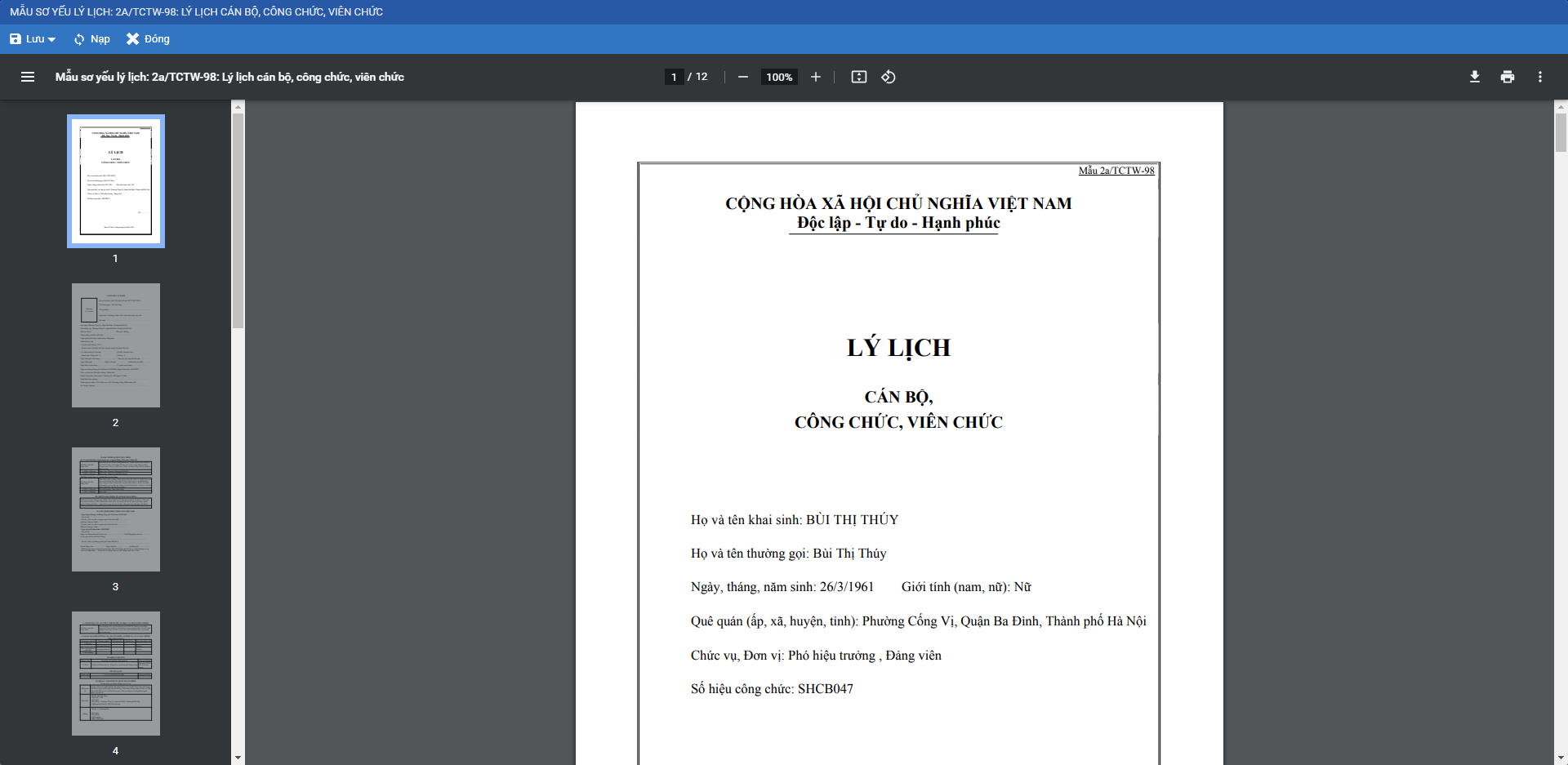 Hoặc anh/chị cũng có thể in Mẫu sơ yếu lý lịch 2a/TCTW-98: Lý lịch cán bộ, công chức, viên chức tại hồ sơ chi tiết của CBNV bằng cách nhấn In.
