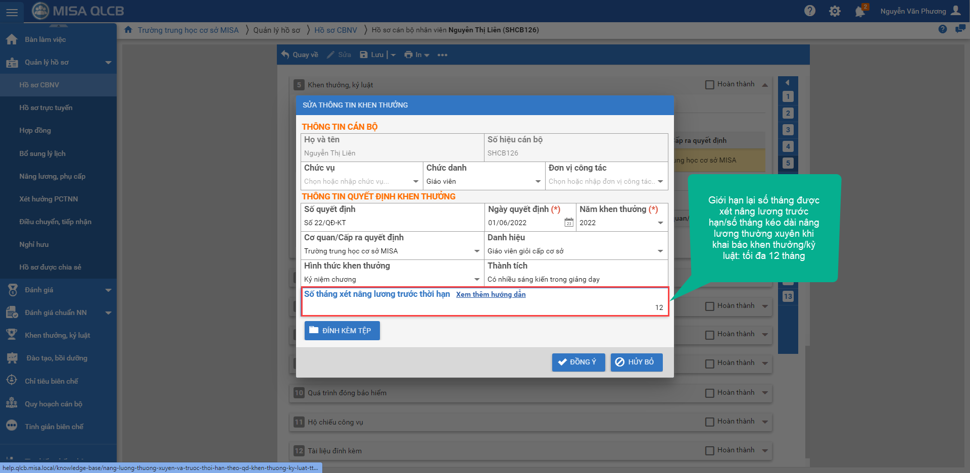 Tại menu Quản trị hồ sơ\Hồ sơ CBNV, khi khai báo thông tin khen thưởng, nhập số tháng xét nâng lương trước hạn, phần mềm chỉ cho nhập số tháng nâng lương trước hạn tối đa là 12, nếu nhập số tháng lớn hơn 12 thì sẽ không lưu được.