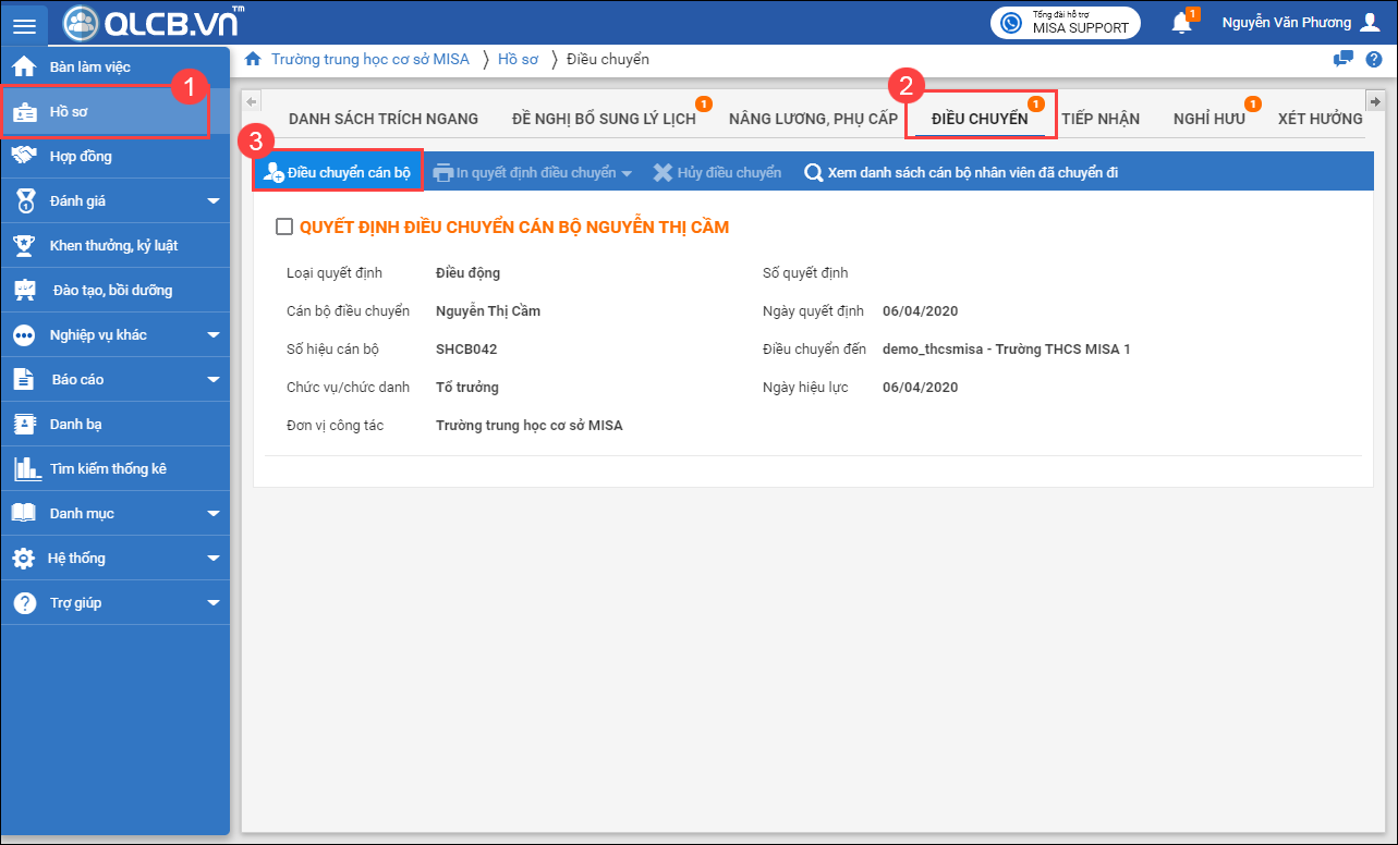 1. Vào menu Hồ sơ, chọn tab Điều chuyển. Nhấn Điều chuyển cán bộ.
