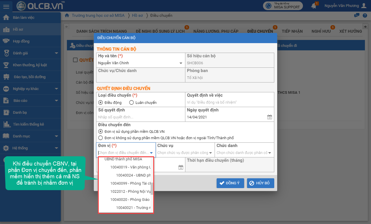 3. Tại phần Quyết định điều chuyển, nếu điều chuyển CBNV đến đơn vị có sử dụng phần mềm QLCB.VN, khi chọn đơn vị, phần mềm sẽ hiển thị mã ngân sách cho đơn vị chọn điều chuyển để tránh nhầm đơn vị.
