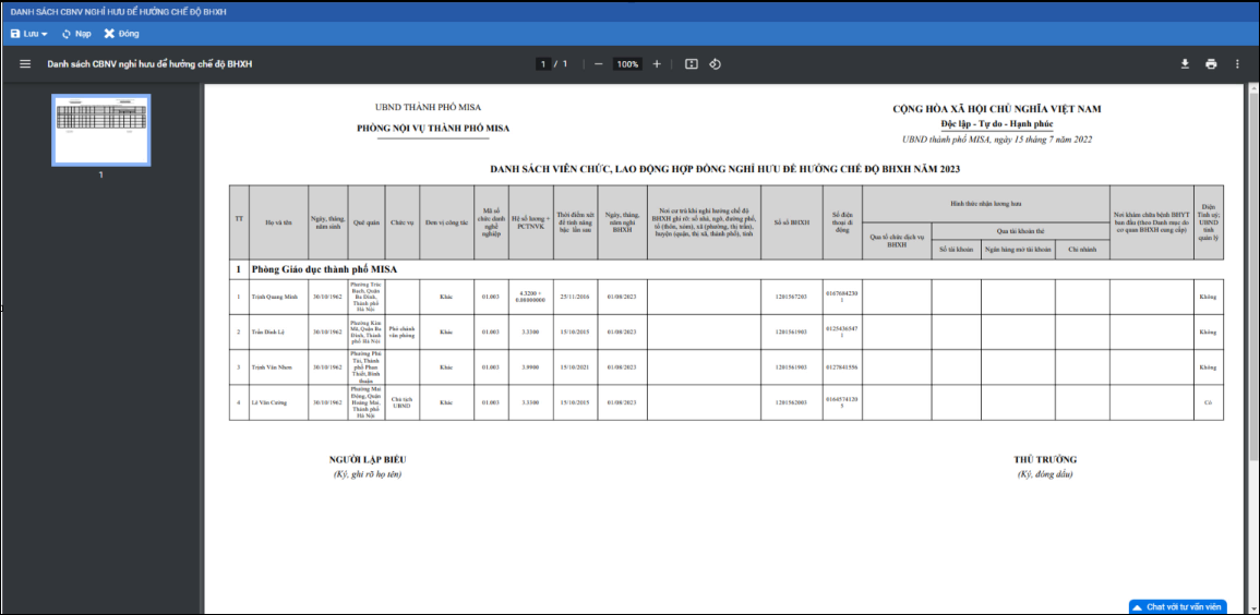 Giúp CBTC in được danh sách nghỉ hưu hàng năm để lưu trữ thông tin.