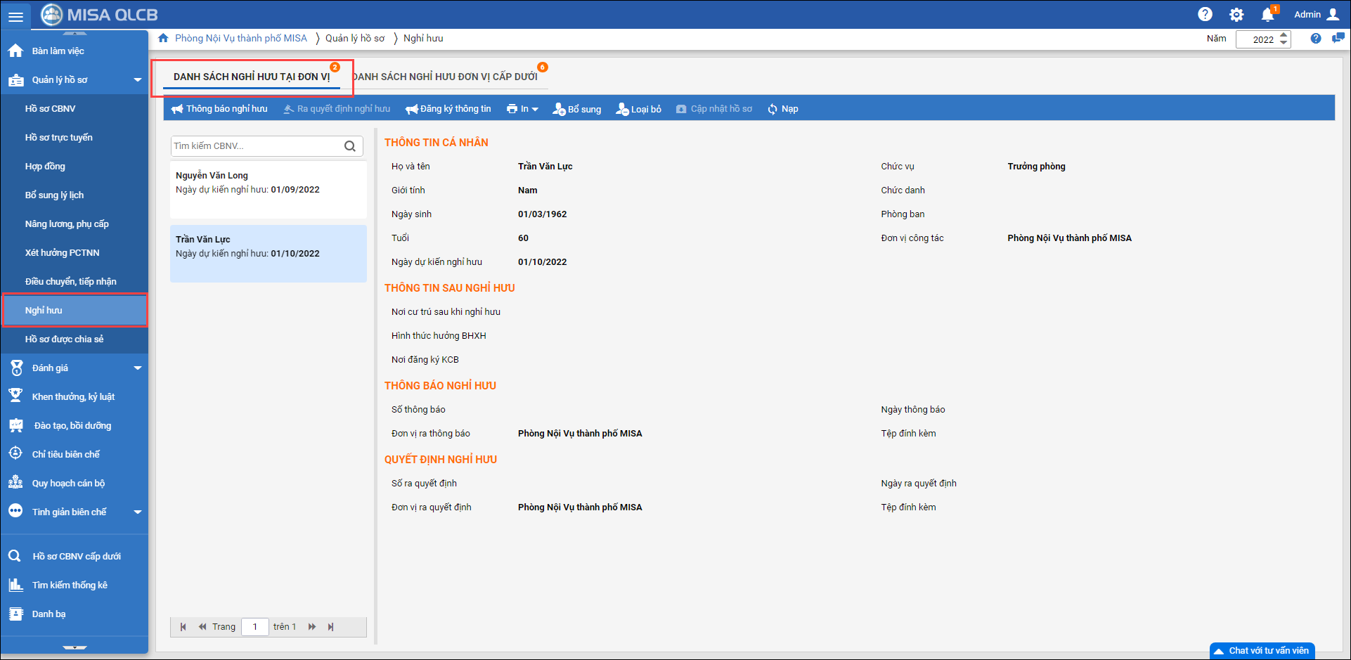 2. Tại tab Danh sách nghỉ hưu tại đơn vị: