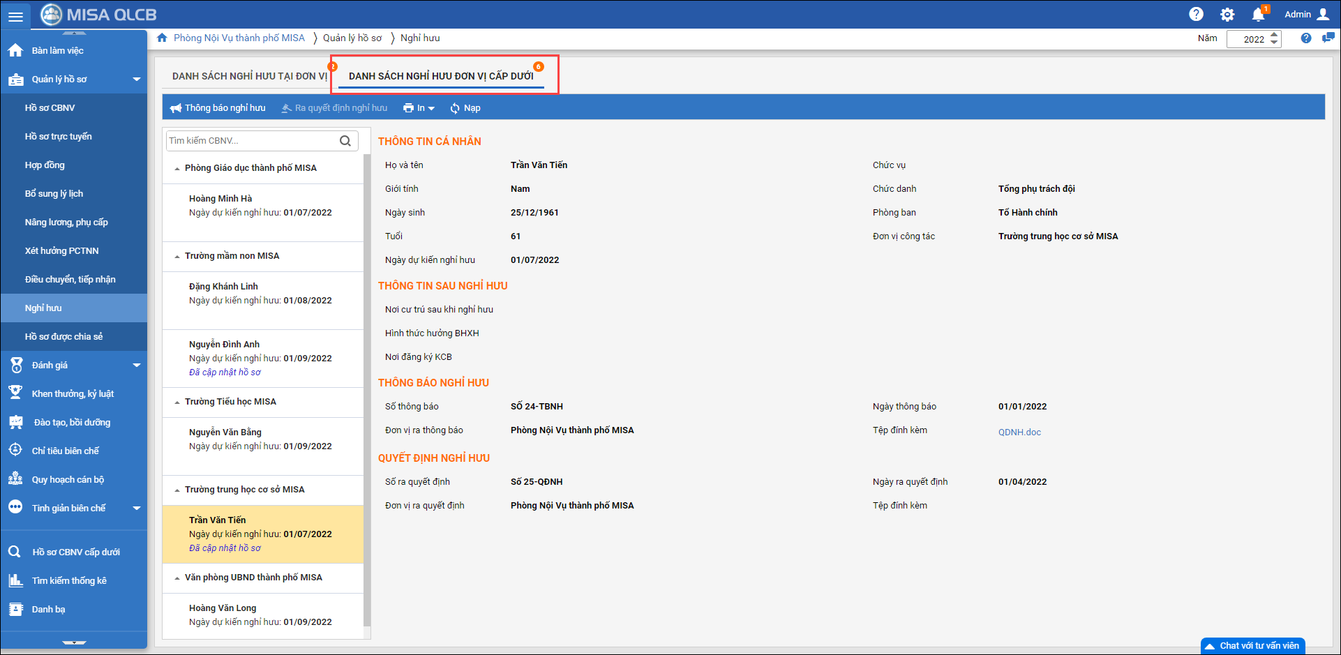 3. Tại tab Danh sách nghỉ hưu đơn vị cấp dưới