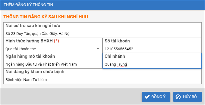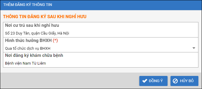 - Có thể nhấn Đăng ký thông tin để đăng ký thông tin sau khi nghỉ hưu của CBNV